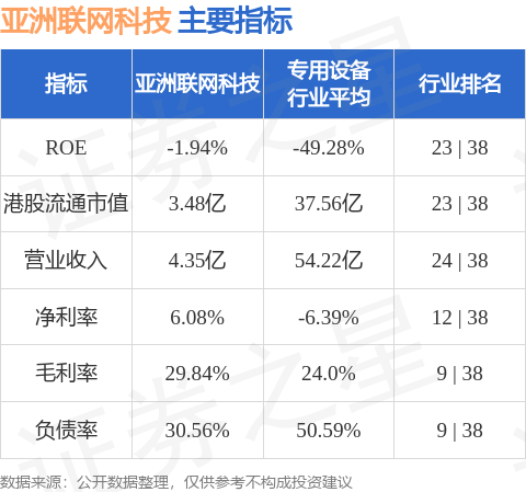 亚洲联网科技港股市值3.48亿港元,在专用设备行业中排名第23。主要指标见下表: