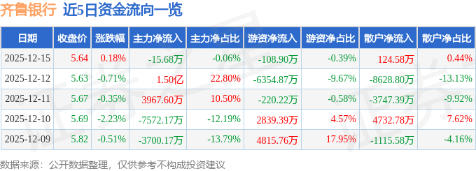 证券之星消息,截至2025年12月15日收盘,齐鲁银行(601665)报收于5.64元,上涨0.18%,换手率0.81%,成交量49.92万手,成交额2.82亿元。