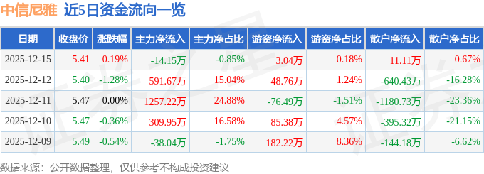 证券之星消息,截至2025年12月15日收盘,中信尼雅(600084)报收于5.41元,上涨0.19%,换手率0.27%,成交量3.08万手,成交额1662.65万元。