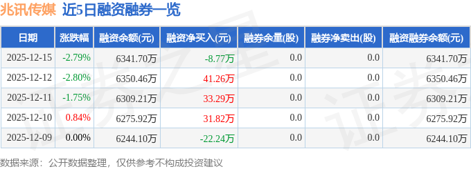 兆讯传媒融资融券信息显示,融资方面,当日融资买入489.51万元,融资偿还498.28万元,融资净偿还8.77万元。融券方面,融券卖出0.0股,融券偿还0.0股,融券余量0.0股,融券余额0.0万元。融资融券余额6341.7万元。