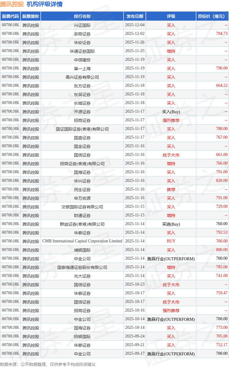 投行对该股的评级以买入为主,近90天内共有23家投行给出买入评级,近90天的目标均价为753.76港元。兴证国际最新一份研报给予腾讯控股买入评级。