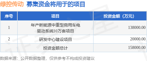 证券之星消息,苏州绿控传动科技股份有限公司(简称:绿控传动)拟在深交所创业板上市,募资总金额为15.8亿元,保荐机构为中国国际金融股份有限公司。募集资金拟用于年产新能源中重型商用车电驱动系统10万套项目、研发中心建设项目,详见下表: