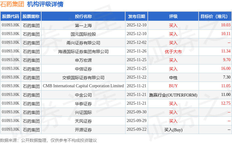 投行对该股的评级以买入为主,近90天内共有8家投行给出买入评级,近90天的目标均价为11.03港元。第一上海最新一份研报给予石药集团买入评级,目标价10.03港元。