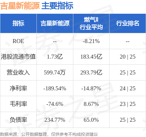 吉星新能源港股市值1.73亿港元,在燃气Ⅱ行业中排名第20。主要指标见下表: