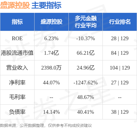 盛源控股港股市值1.74亿港元,在多元金融行业中排名第84。主要指标见下表: