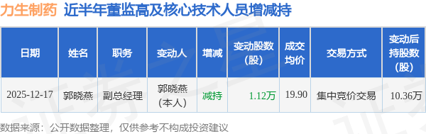 证券之星消息,根据12月17日市场公开信息、上市公司公告及交易所披露数据整理,力生制药(002393)最新董监高及相关人员股份变动情况:2025年12月17日公司副总经理郭晓燕共减持公司股份1.12万股,占公司总股本为0.0043%。变动期间公司股价上涨0.2%,12月17日当日收盘报19.96元。