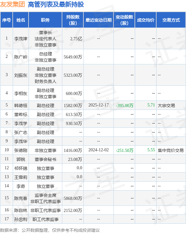友发集团近半年内的董监高及核心技术人员增减持详情如下: