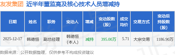 证券之星消息,根据12月17日市场公开信息、上市公司公告及交易所披露数据整理,友发集团(601686)最新董监高及相关人员股份变动情况:2025年12月17日公司副总经理韩德恒共减持公司股份395.0万股,占公司总股本为0.2685%。变动期间公司股价下跌2.44%,12月17日当日收盘报6.39元。