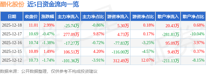 证券之星消息,截至2025年12月18日收盘,醋化股份(603968)报收于11.01元,上涨2.99%,换手率1.34%,成交量2.73万手,成交额3004.2万元。