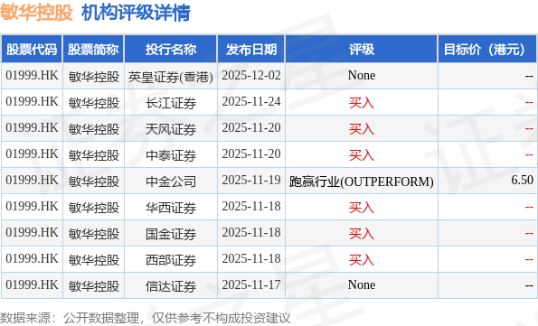 投行对该股的评级以买入为主,近90天内共有6家投行给出买入评级,近90天的目标均价为6.5港元。英皇证券(香港)最新一份研报给予敏华控股None评级。