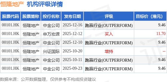 投行对该股的评级以跑赢行业(OUTPERFORM)为主,近90天内共有4家投行给出跑赢行业(OUTPERFORM)评级,近90天的目标均价为9.91港元。中金公司最新一份研报给予恒隆地产跑赢行业(OUTPERFORM)评级,目标价9.46港元。