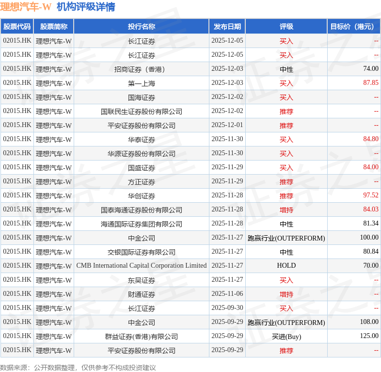 投行对该股的评级以买入为主,近90天内共有9家投行给出买入评级,近90天的目标均价为89.78港元。长江证券最新一份研报给予理想汽车-W买入评级。