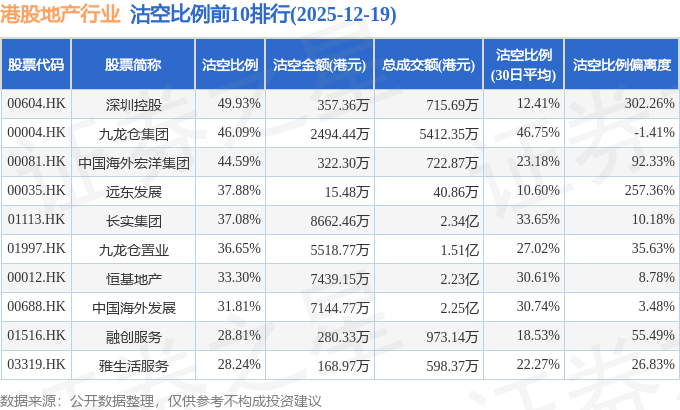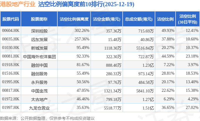 从沽空比例偏离度来看,深圳控股、远东发展、新城发展沽空比例偏离度位居行业前三,分别为302.26%、257.36%、95.49%。