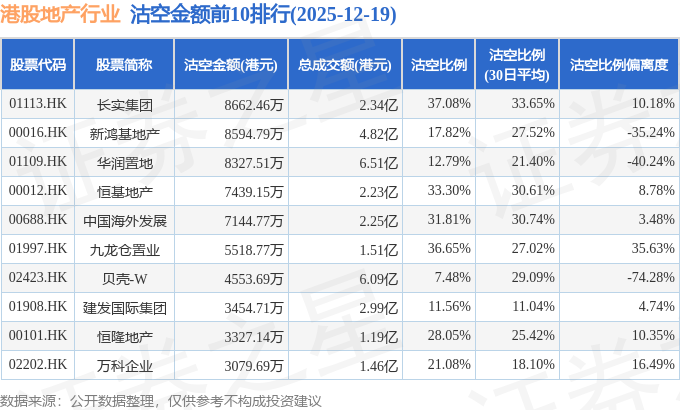 从沽空金额来看,长实集团、新鸿基地产、华润置地沽空金额位居行业前三,分别为8662.46万港元、8594.79万港元、8327.51万港元。