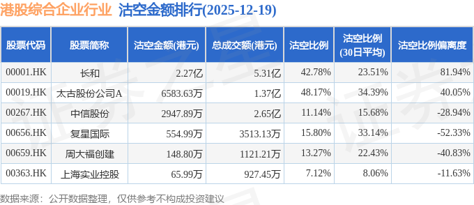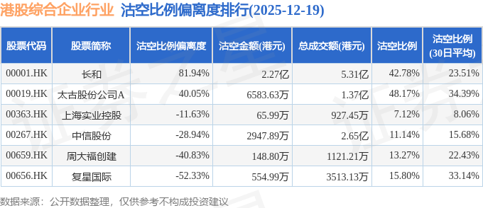 从沽空比例偏离度来看,长和、太古股份公司A、上海实业控股沽空比例偏离度位居行业前三,分别为81.94%、40.05%、-11.63%。