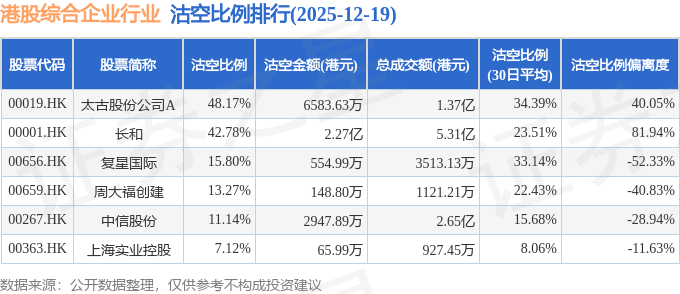 从沽空比例来看,太古股份公司A、长和、复星国际沽空比例位居行业前三,分别为48.17%、42.78%、15.8%。