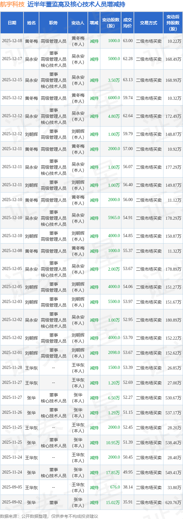 航宇科技近半年内的董监高及核心技术人员增减持详情如下:
