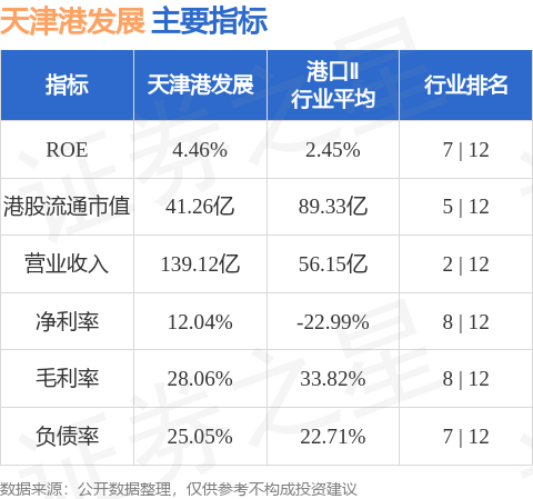 天津港发展港股市值41.26亿港元,在港口Ⅱ行业中排名第5。主要指标见下表: