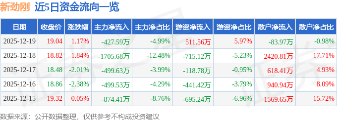 证券之星消息,截至2025年12月19日收盘,新劲刚(300629)报收于19.04元,上涨1.17%,换手率2.08%,成交量4.5万手,成交额8572.55万元。