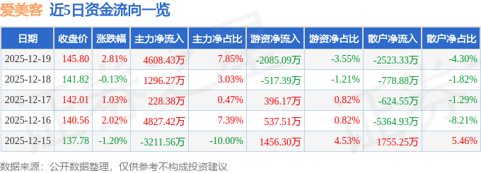 证券之星消息,截至2025年12月19日收盘,爱美客(300896)报收于145.8元,上涨2.81%,换手率1.95%,成交量4.06万手,成交额5.87亿元。