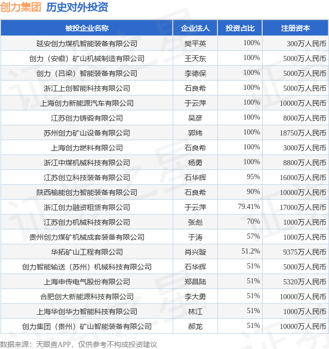 证券之星消息,根据天眼查APP显示,创力集团(603012.SH)新增一起对外投资事件,被投资公司为延安创力煤机智能装备有限公司,法定代表人樊平英,投资占比为100%。该公司从事专用设备制造业,注册资本为300万人民币。目前,创力集团共存在对外投资32项,投资占比前20的项目见下表: