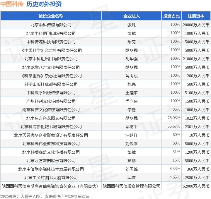 证券之星消息,根据天眼查APP显示,中国科传(601858.SH)新增一起对外投资事件,被投资公司为北京中科传媒有限公司,法定代表人张凡,投资占比为100%。该公司从事广播、电视、电影和录音制作业,注册资本为20000万人民币。目前,中国科传共存在对外投资20项,详见下表: