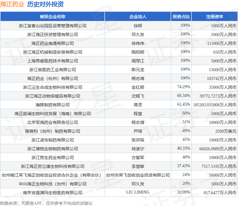 通过天眼查大数据分析,浙江海正药业股份有限公司共对外投资了28家企业,参与招投标项目5325次;财产线索方面有商标信息227条,专利信息500条,著作权信息1条;此外企业还拥有行政许可411个。据2024年报数据,海正药业长期股权投资14.3亿元,同比增2.55%。