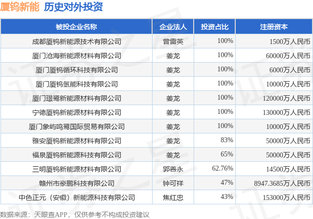 证券之星消息,根据天眼查APP显示,厦钨新能(688778.SH)新增一起对外投资事件,被投资公司为成都厦钨新能源技术有限公司,法定代表人曾雷英,投资占比为100%。该公司从事科技推广和应用服务业,注册资本为1500万人民币。目前,厦钨新能共存在对外投资12项,详见下表: