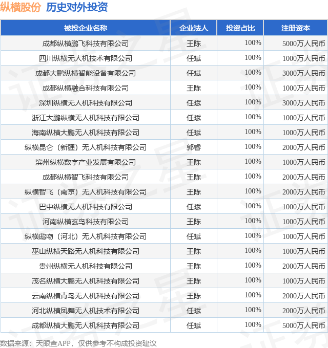 证券之星消息,根据天眼查APP显示,纵横股份(688070.SH)新增一起对外投资事件,被投资公司为北京纵横大禹无人机科技有限公司,法定代表人任斌,投资占比为70%。该公司从事科技推广和应用服务业,注册资本为100万人民币。目前,纵横股份共存在对外投资37项,投资占比前20的项目见下表: