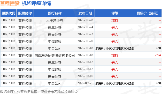 投行对该股的评级以买入为主,近90天内共有6家投行给出买入评级,近90天的目标均价为3.18港元。太平洋证券最新一份研报给予首程控股增持评级。