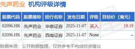 投行对该股的评级以买入为主,近90天内共有1家投行给出买入评级,近90天的目标均价为19.19港元。华泰证券最新一份研报给予先声药业买入评级,目标价19.19港元。