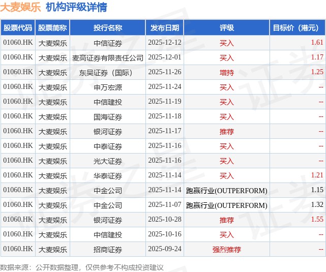 截至2025年12月22日收盘,大麦娱乐(01060.HK)报收于0.91港元,上涨4.6%,成交量1.14亿股,成交额1.02亿港元。投行对该股的评级以买入为主,近90天内共有9家投行给出买入评级,近90天的目标均价为1.32港元。中信证券最新一份研报给予大麦娱乐买入评级,目标价1.61港元。