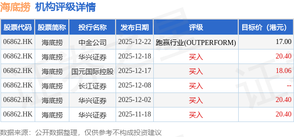 截至2025年12月22日收盘,海底捞(06862.HK)报收于14.85港元,上涨0.54%,成交量1800.5万股,成交额2.66亿港元。投行对该股的评级以买入为主,近90天内共有5家投行给出买入评级,近90天的目标均价为19.25港元。中金公司最新一份研报给予海底捞跑赢行业(OUTPERFORM)评级,目标价17港元。
