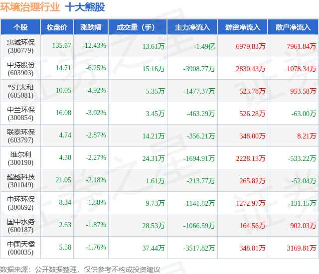 个股表现方面,环境治理行业当日领跌股为惠城环保(300779),该股当日报收135.87,下跌12.43%,成交量13.61万,主力资金净流出1.49亿元。中持股份(603903)以下跌6.25%紧随其后,该股当日成交量15.16万,主力资金净流出3908.77万元。除此之外,*ST太和(605081)、中兰环保(300854)、联泰环保(603797)均进入当日熊股之列。具体个股列表见下表: