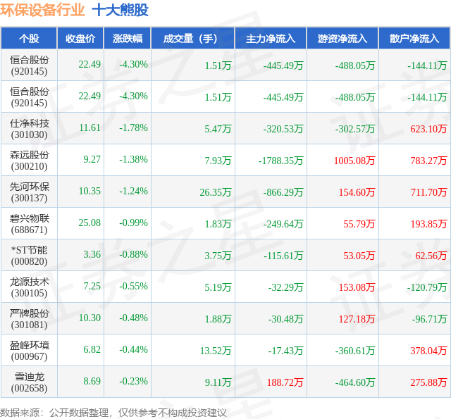 个股表现方面,环保设备行业当日领跌股为恒合股份(920145),该股当日报收22.49,下跌4.3%,成交量1.51万,主力资金净流出445.49万元。恒合股份(920145)以下跌4.3%紧随其后,该股当日成交量1.51万,主力资金净流出445.49万元。除此之外,仕净科技(301030)、森远股份(300210)、先河环保(300137)均进入当日熊股之列。具体个股列表见下表: