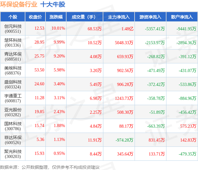 个股表现方面,环保设备行业当日领涨股为创元科技(000551),该股当日报收12.53,上涨10.01%,成交量68.53万,主力资金净流入1.48亿元。楚环科技(001336)以上涨9.99%紧随其后,该股当日成交量10.52万,主力资金净流入5048.33万元。除此之外,青达环保(688501)、美埃科技(688376)、盛剑科技(603324)均进入当日牛股之列。具体个股列表见下表: