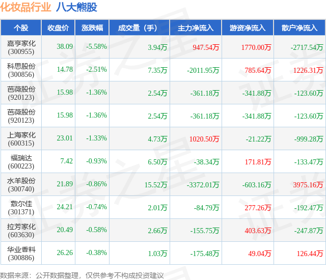 个股表现方面,化妆品行业当日领跌股为嘉亨家化(300955),该股当日报收38.09,下跌5.58%,成交量3.94万,主力资金净流入947.54万元。科思股份(300856)以下跌2.51%紧随其后,该股当日成交量7.35万,主力资金净流出2011.95万元。除此之外,芭薇股份(920123)、芭薇股份(920123)、上海家化(600315)均进入当日熊股之列。具体个股列表见下表:
