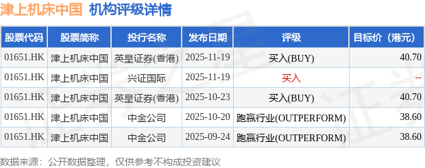 截至2025年12月22日收盘,津上机床中国(01651.HK)报收于33.0港元,上涨4.3%,成交量88.4万股,成交额2908.89万港元。投行对该股的评级以跑赢行业(OUTPERFORM)为主,近90天内共有2家投行给出跑赢行业(OUTPERFORM)评级,近90天的目标均价为39.65港元。英皇证券(香港)最新一份研报给予津上机床中国买入(BUY)评级,目标价40.7港元。