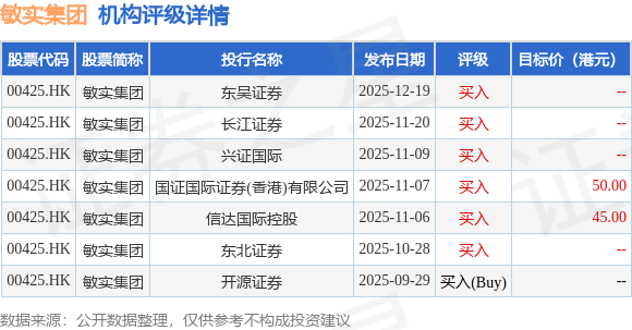 截至2025年12月22日收盘,敏实集团(00425.HK)报收于31.82港元,上涨0.25%,成交量421.51万股,成交额1.35亿港元。投行对该股的评级以买入为主,近90天内共有6家投行给出买入评级,近90天的目标均价为47.5港元。东吴证券最新一份研报给予敏实集团买入评级。
