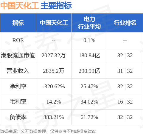 中国天化工港股市值2027.32万港元,在电力行业中排名第32。主要指标见下表: