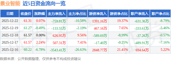 证券之星消息,截至2025年12月22日收盘,景业智能(688290)报收于61.31元,上涨0.07%,换手率1.15%,成交量1.17万手,成交额7182.08万元。