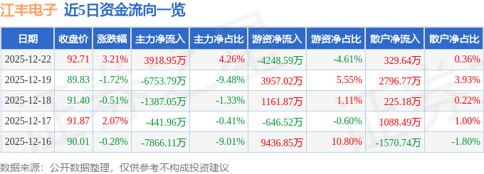 12月22日的资金流向数据方面,主力资金净流入3918.95万元,占总成交额4.26%,游资资金净流出4248.59万元,占总成交额4.61%,散户资金净流入329.64万元,占总成交额0.36%。