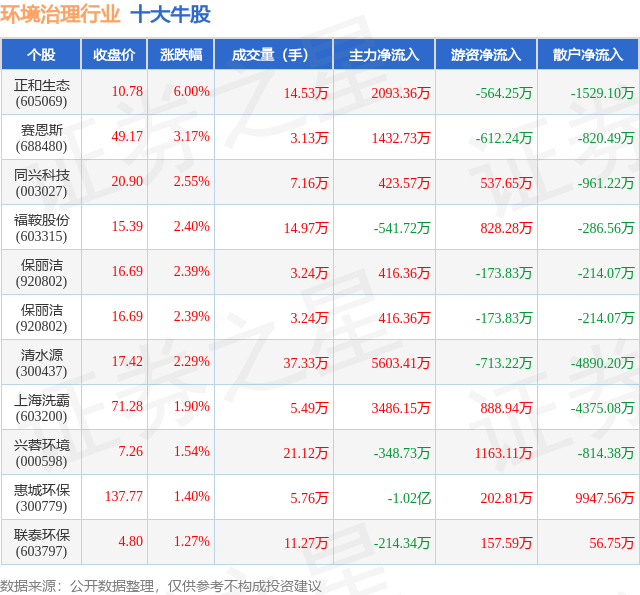 个股表现方面,环境治理行业当日领涨股为正和生态(605069),该股当日报收10.78,上涨6.0%,成交量14.53万,主力资金净流入2093.36万元。赛恩斯(688480)以上涨3.17%紧随其后,该股当日成交量3.13万,主力资金净流入1432.73万元。除此之外,同兴科技(003027)、福鞍股份(603315)、保丽洁(920802)均进入当日牛股之列。具体个股列表见下表:
