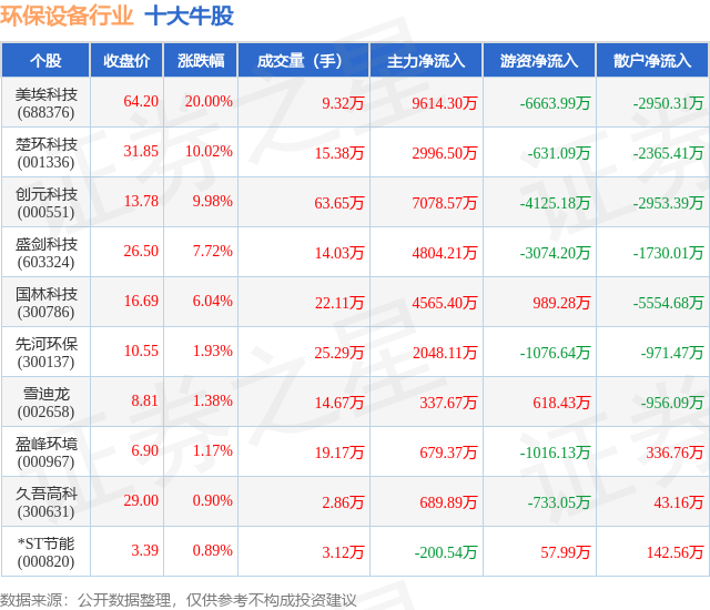 个股表现方面,环保设备行业当日领涨股为美埃科技(688376),该股当日报收64.2,上涨20.0%,成交量9.32万,主力资金净流入9614.3万元。楚环科技(001336)以上涨10.02%紧随其后,该股当日成交量15.38万,主力资金净流入2996.5万元。除此之外,创元科技(000551)、盛剑科技(603324)、国林科技(300786)均进入当日牛股之列。具体个股列表见下表: