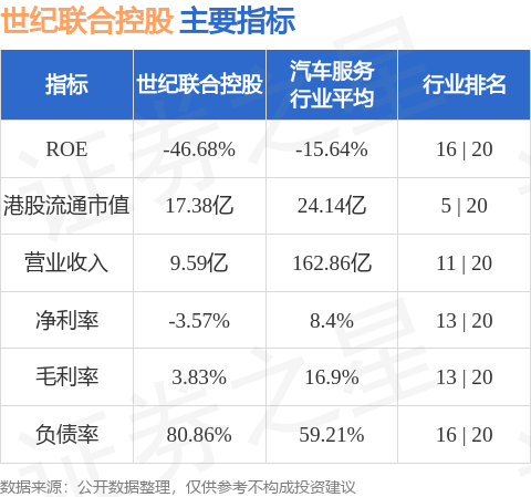 世纪联合控股港股市值17.38亿港元,在汽车服务行业中排名第5。主要指标见下表: