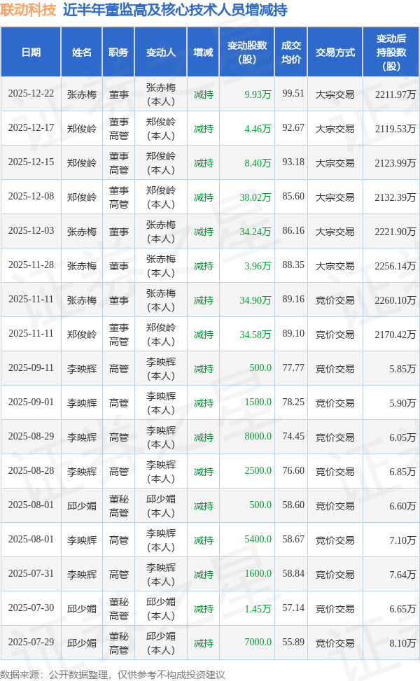 联动科技近半年内的董监高及核心技术人员增减持详情如下: