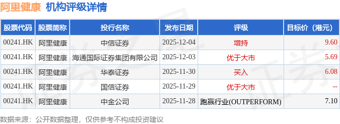 截至2025年12月24日收盘,阿里健康(00241.HK)报收于5.14港元,下跌1.53%,成交量3320.66万股,成交额1.71亿港元。投行对该股的评级以优于大市为主,近90天内共有2家投行给出优于大市评级,近90天的目标均价为7.12港元。中信证券最新一份研报给予阿里健康增持评级,目标价9.6港元。