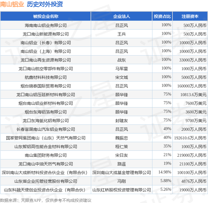 证券之星消息,根据天眼查APP显示,南山铝业(600219.SH)新增一起对外投资事件,被投资公司为海南南山铝业有限公司,法定代表人吕正风,投资占比为100%。该公司从事有色金属冶炼和压延加工业,注册资本为500万人民币。目前,南山铝业共存在对外投资21项,投资占比前20的项目见下表: