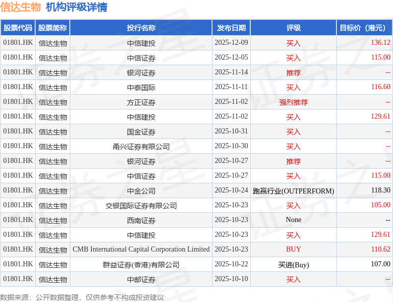 投行对该股的评级以买入为主,近90天内共有10家投行给出买入评级,近90天的目标均价为118.29港元。中信建投最新一份研报给予信达生物买入评级,目标价136.12港元。