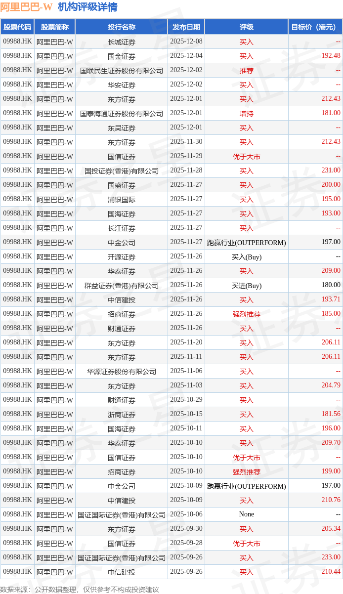 投行对该股的评级以买入为主,近90天内共有26家投行给出买入评级,近90天的目标均价为201.67港元。长城证券最新一份研报给予阿里巴巴-W买入评级。